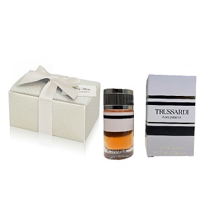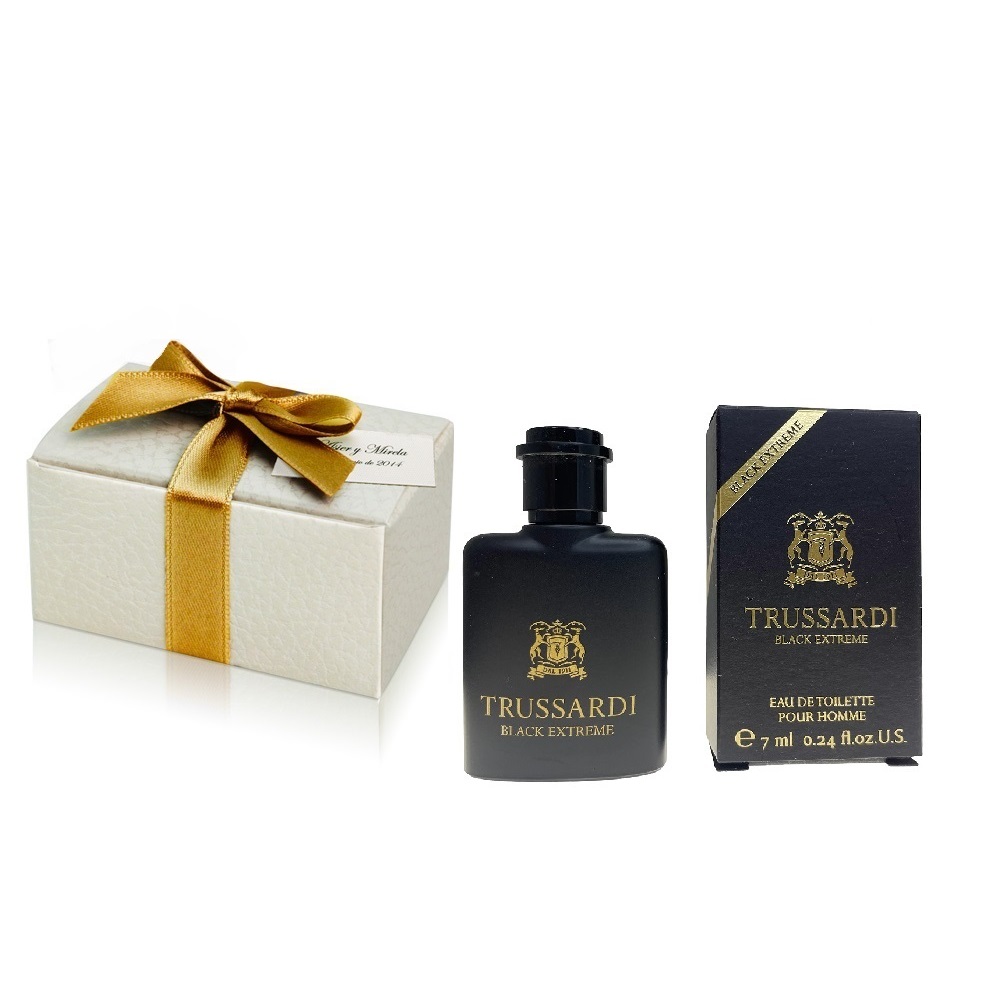 Mini perfume original Trussardi Black Extreme para hombre 7 ml EDT con su cajita corporativa envuelta en cajita blanca con tarjeta