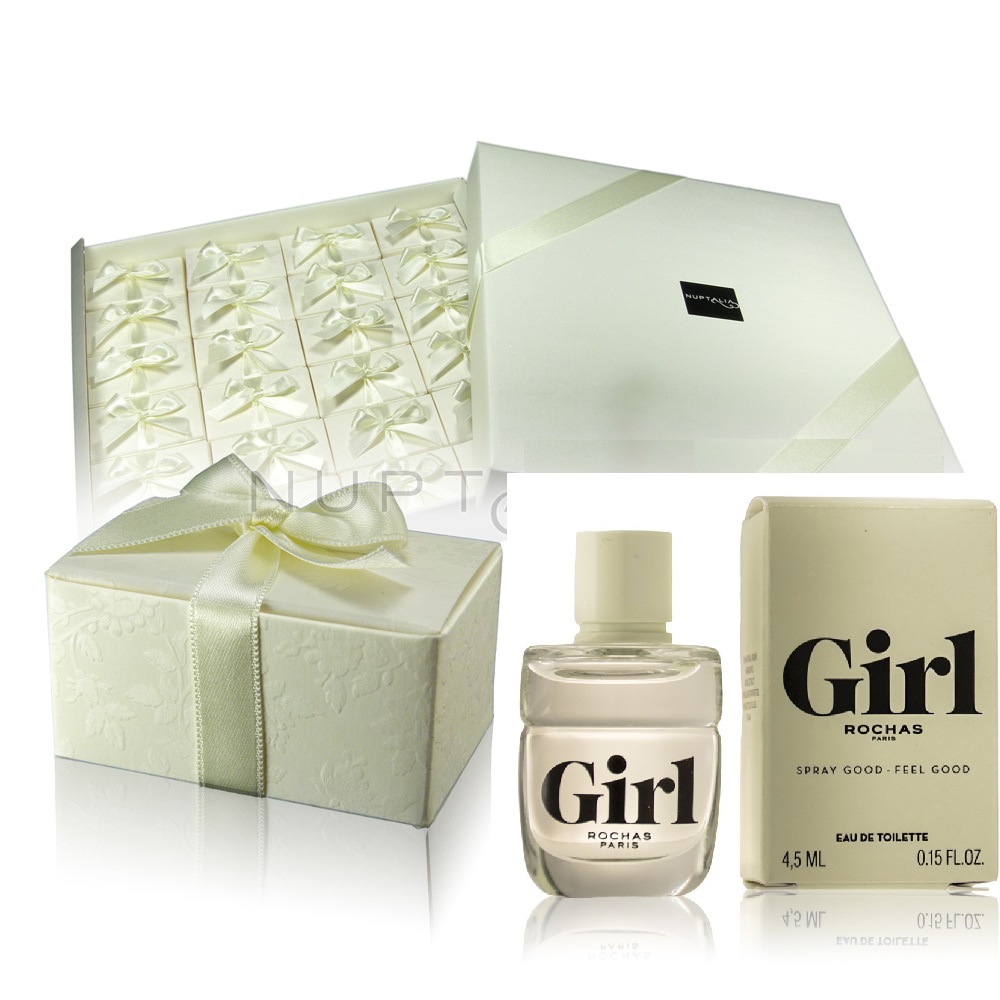Pack 24 mini perfumes Rochas girl 4,5 ml EDT en cajita blanca con tarjeta personalizada. El acabado de la cajita blanca puede variar respecto a la fotografía según disponibilidad