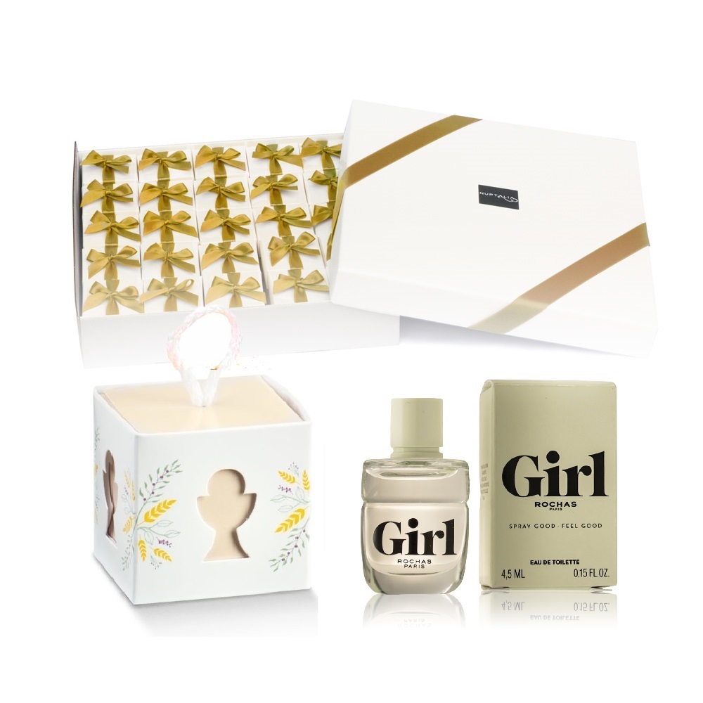 Pack 25 mini perfumes Rochas Girl EDT en cajita comunion con tarjeta personalizada. El acabado de la cajita blanca puede variar respecto a la fotografía según disponibilidad.